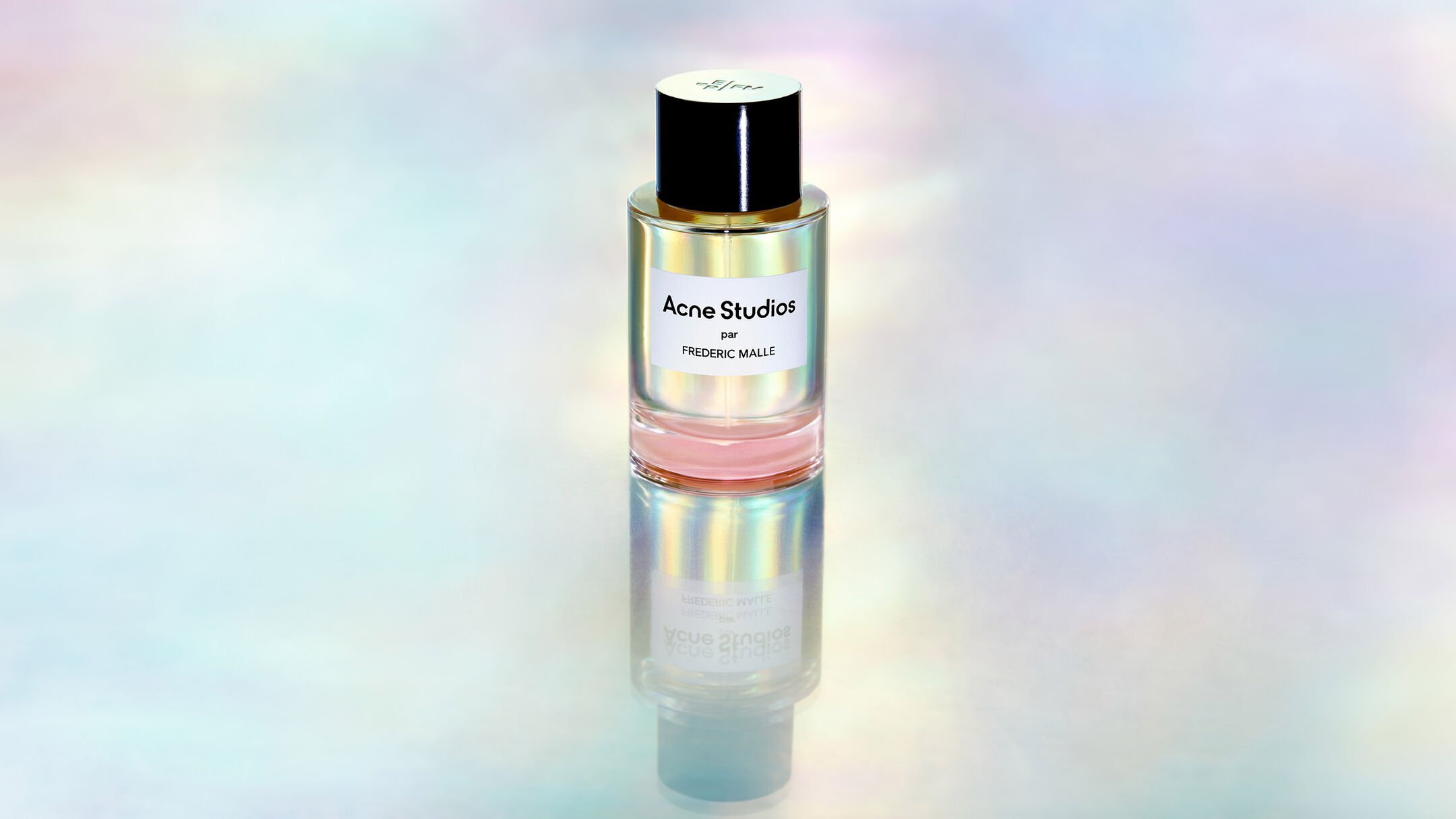 Acne Studios perfume collaboration with Frederic Malle perfume bottle with a unique, iridescence blue-pink background on one side, and a close-up on a female model with long dark hair on the other.
